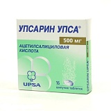 УПСАРИН таб. шип. 500мг №16 Упса Склад діюча речовина: ацетилсаліцилова кислота; 1 таблетка містить ацетилсаліцилової кислоти 500 мг; допоміжні речовини: натрію гідрокарбонат, кислота лимонна безводна, натрію цитрат безводний, натрію карбонат безводний,...